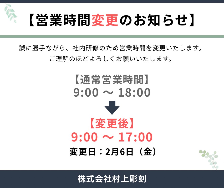 お知らせ スタッフブログ 2026年2月6日(金)営業時間変更のお知らせ 2026年1月16日(金)営業時間変更のお知らせ 2026年 新年のご挨拶 年末年始休業日のお知らせ 中学生2名が職場体験に来てくれました! 「オータムフェスタ2025」に出店しました! 「オータムフェスタ2025」に出店します! 夏季休業のお知らせ 佐世保ベースさんが遊びに来てくれました! 大雪による臨時休業のお知らせ 「スポットインサセボ」で紹介されます! 新年のご挨拶 年末のご挨拶 年末年始休業日のお知らせ ゴールデンウィーク休業日のお知らせ 新しい仲間が加わりました! ■2024夏季休業のお知らせ■ 村上彫刻より【ゴールデンウィーク休業のお知らせ】 村上彫刻より【新年のご挨拶】 村上彫刻より【年末年始休業のお知らせ】